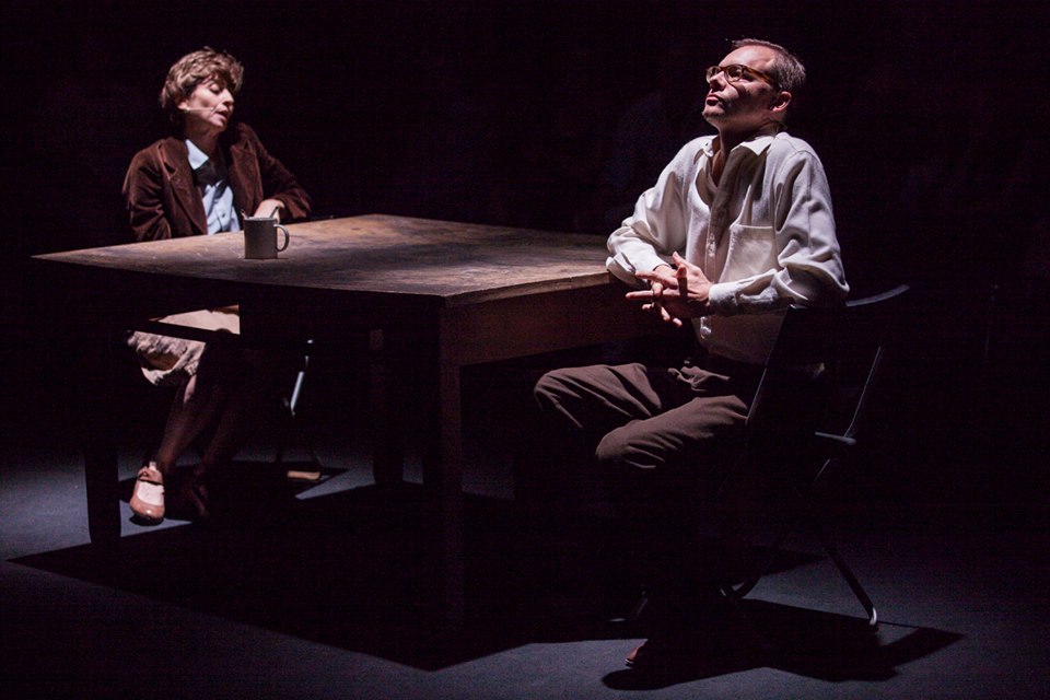 Dagli spalti disposti ai quattro lati dello spazio scenico i visi degli spettatori compongono nella semioscurità le pareti di una stanza, arredata da un tavolo e da un attaccapanni. Giorgina Pi – artista e regista romana qui in collaborazione con la compagnia Bluemotion – scommette nella potenza immaginifica delle parole di Caryl Churchill e lascia che Caffettiera blu si dipani dall’inizio alla fine nello stesso contesto scenografico. A ri-designare di volta in volta la scena sono infatti soltanto didascalie in voice over: bar, stazione, parco, e ancora salotto domestico e ospedale geriatrico. Sono questi i luoghi in cui Derek, giovane truffatore, irretisce diverse donne, convincendole ad accoglierlo come il figlio biologico perduto, dato in adozione appena nato; ed è qui che l’uomo infine incontra la sua vera madre, obnubilata dalla demenza senile.