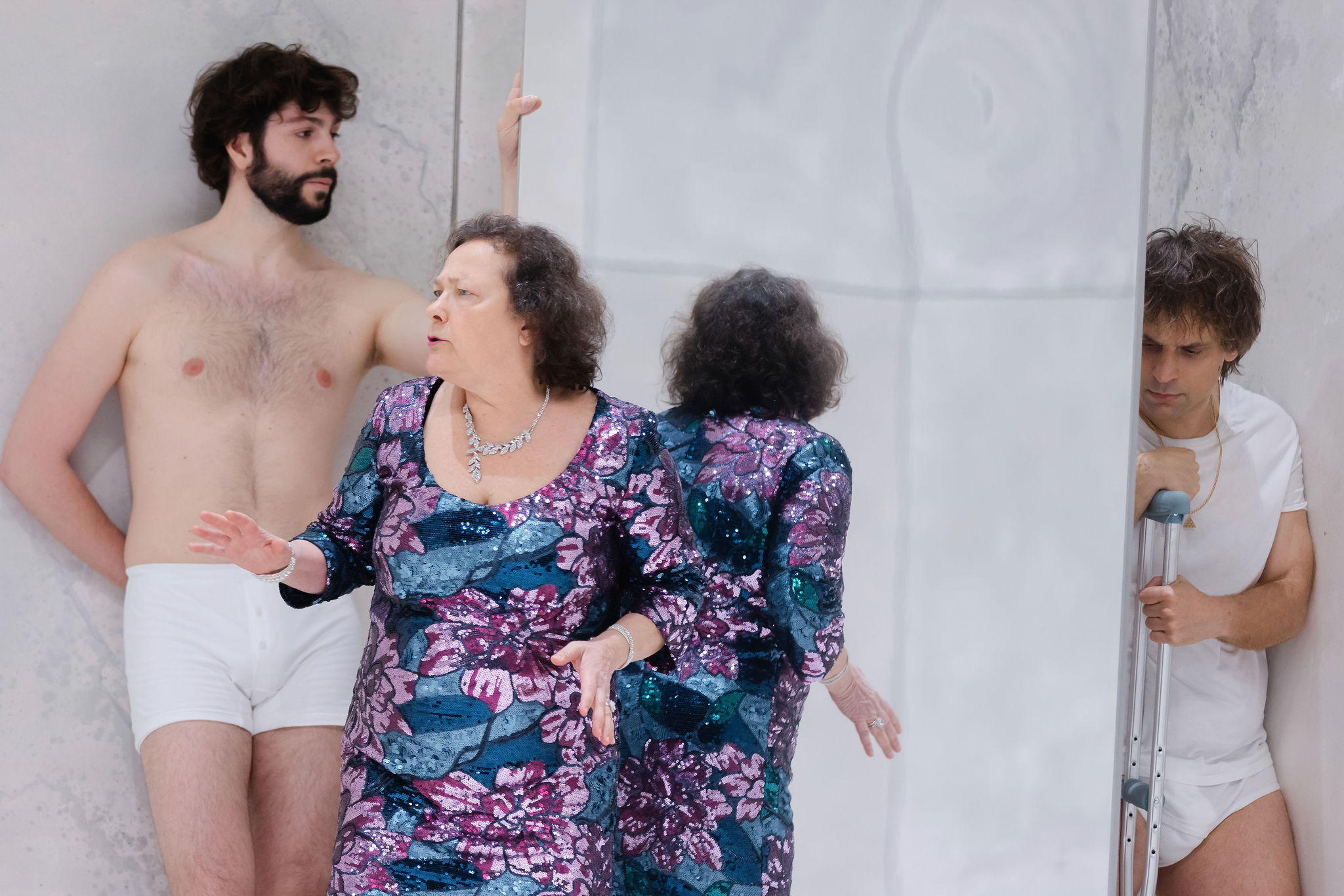 L’ipotetica verità di un amore tra i due uomini — quel «fatto inammissibile per negare l’esistenza del quale Skipper è morto», come annota Williams in una lunga didascalia del secondo atto — diventa il terreno sul quale discutono, cercano un contatto, rifuggono e si confidano Brick e il padre, in uno dei momenti più alti di questa Gatta che proprio nella qualità attorale ha uno dei suoi punti di forza: Cabra è un animale ferito in una gabbia di insinuazioni, prima passivo di fronte al cameratismo con il quale Papà cerca di sollevarlo dall’indolenza alcolica, e poi impetuoso nella forza con cui lo provoca a pronunciare quella parola e quella paura, nella vampa con cui getta addosso al padre quel «frocio!», quel sospetto che aleggia su di lui e sul fantasma di Brick. Pannelli è invece un self-made man arrogante e spietato, in grado di resistere all’ascolto della verità — su Skipper, e sulla propria salute — e di nasconderla sotto l’ennesima menzogna: una gravidanza che Maggie annuncia come una promessa di futuro. Puzza di cadavere, l’ipocrisia che contagia come una pestilenza i membri della famiglia Pollitt, e a recare a Papà l’infausta prognosi è lo stesso Micheletti, in una sovrapposizione di ruoli che amplifica e rende plastici i riverberi letali tra inganno e morte, tra perbenismo e annichilimento. Ma nessuna morale attende oggi lo spettatore, né tantomeno quell’happy ending — passionale ed eteronormativo — sancito nel film da un bacio tra Elizabeth Taylor e Paul Newman: una nuova bugia si sostituisce all’altra, una nuova strategia di sopravvivenza si impone in un inferno banale e meschino. E una commedia, per la quale «morire dal ridere», occulta la tragedia, come un sipario.
