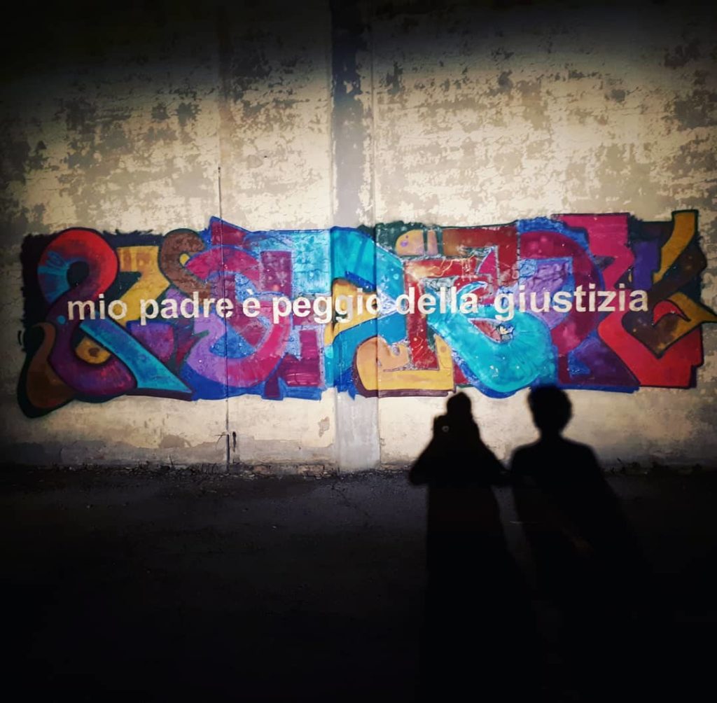 Il racconto inizia però ancora prima di entrare in quello spazio oscuro, simile a una stanza di un’infanzia (non tanto accogliente) che ospita la mostra. Appena entrati nel cortile interno dell’EXATR lo sguardo di ogni visitatore viene infatti attirato da un grande, coloratissimo murale su cui campeggia, in negativo e in caratteri precisi, la scritta mio padre è peggio della giustizia. Tratta dal romanzo Paesi tuoi di Cesare Pavese è Luca Bertolo che la imprime, facendola resistere – per il tempo limitato della mostra – al muro che si sgretola e alla vernice spray. Il contrasto tra libertà e dogma, si fa specchio del rapporto dell’artista con il granitico padre, l’anarchico Amedeo Bertolo. Molti i selfie e le fotografie scattate dagli spettatori di fronte a quest’opera, il cui carattere conturbante è solo un antipasto dell’intransigenza paterna, che si esprime in tutta la sua potenza non appena entrati nello spazio espositivo.