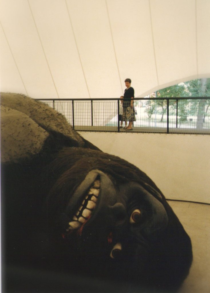 A farsi baricentro della stanza, della mostra e, oltre, dei discorsi che da essa nascono, è l’opera di Fabrizio Prevedello: una grande installazione simile a un letto “scarpiano” cavo e in metallo. Riempito da uno strato d’acqua sottile, al posto del cuscino sembra affiorare un pezzo di marmo; un pezzo grezzo che, per l’artista, potrebbe piacere a due dei suoi maestri, uno professionale e l’altro elettivo: l’artigiano che gli insegnò la tecnica della lavorazione del marmo – che in casa aveva un letto di Carlo Scarpa – e il maestro Constantin Brancusi, artista difficilmente inquadrabile in una corrente o in un movimento. Quel letto, richiamando alla memoria un possibile luogo di riposo, ma facendosi anche eterno monumento funebre, celebra assenza e presenza al contempo. Un po’ come la foto di presentazione della mostra, scelta dal curatore, in cui l’enorme testa di un King Kong – esposto al parco tematico riminese Fiabilandia – nasconde le figure di madre e figlio relegate sullo sfondo. Un padre che a volte non si vede, ma che si può intuire, un genitore assente ma, che è allo stesso tempo, abbondantemente percepibile, al punto di oscurare tutto ciò che gli sta intorno.