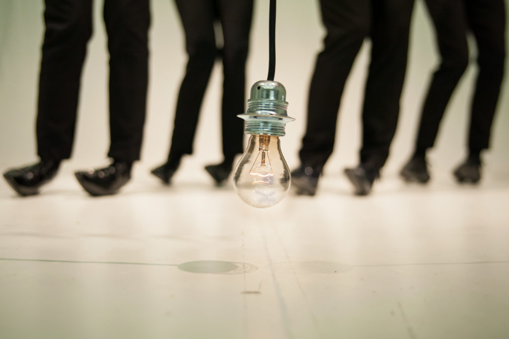 L’opera si apre infatti nel segno del minimalismo: un fondale bianco privo di elementi connotativi per poi comporsi in crescendo con la progressiva entrata in scena di quattro performer vestiti di nero. A dividerli solo un filo, al quale è appesa una lampadina accesa che impercettibilmente guadagna quota, fino a posizionarsi a circa tre metri da terra.