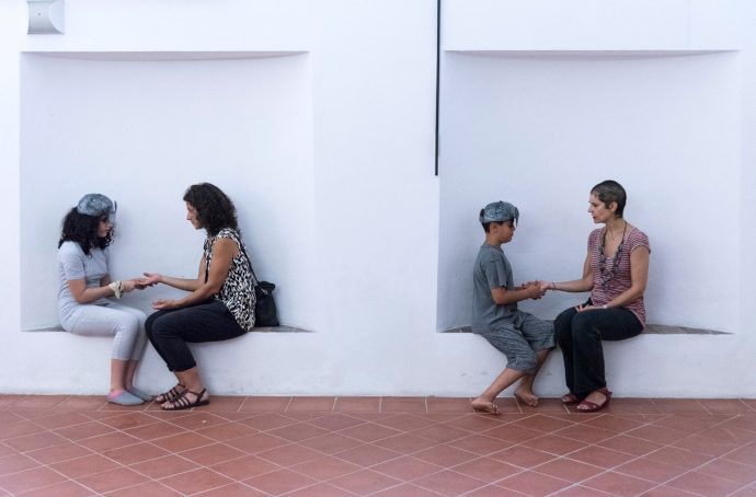 Modalità e tematiche analoghe (vicinanza, intimità e insicurezza) sono quelle provocate da Sparks di Francesca Grilli. Qui il contatto avviene tra il singolo spettatore e un bambino che lo prende per mano, per poi leggergli i segreti nascosti tra le misure, le proporzioni e le linee del palmo. Un atto performativo mediato da condizioni imprescindibili, chiaramente spiegate prima di entrare in sala: tra i due soggetti non ci può essere dialogo, né uno sguardo diretto – ciascun bambino indossa del resto un caschetto con visiera che gli nasconde il viso. Ma, nonostante l’imposizione di queste forme di distanza, le cose che i piccoli vaticinanti ci dicono sono di un’intimità quasi violenta, che ci riporta all’importanza di un contatto, uno scambio profondo che, soprattutto nel quotidiano, è ormai delegato sostanzialmente al rapporto visivo.